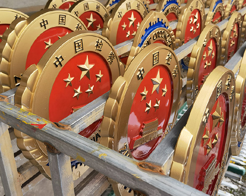 檢察徽的制作通常由專業廠家進行,采用鋅合金材質,通過中型凹凸沖壓成型、鍍金、靜電上漆、注上透明立體水晶等工藝制作而成。圖案、色彩、規格比例需...